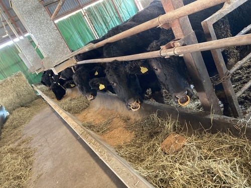 こんばんは。写真は朝の肥育牛たち。